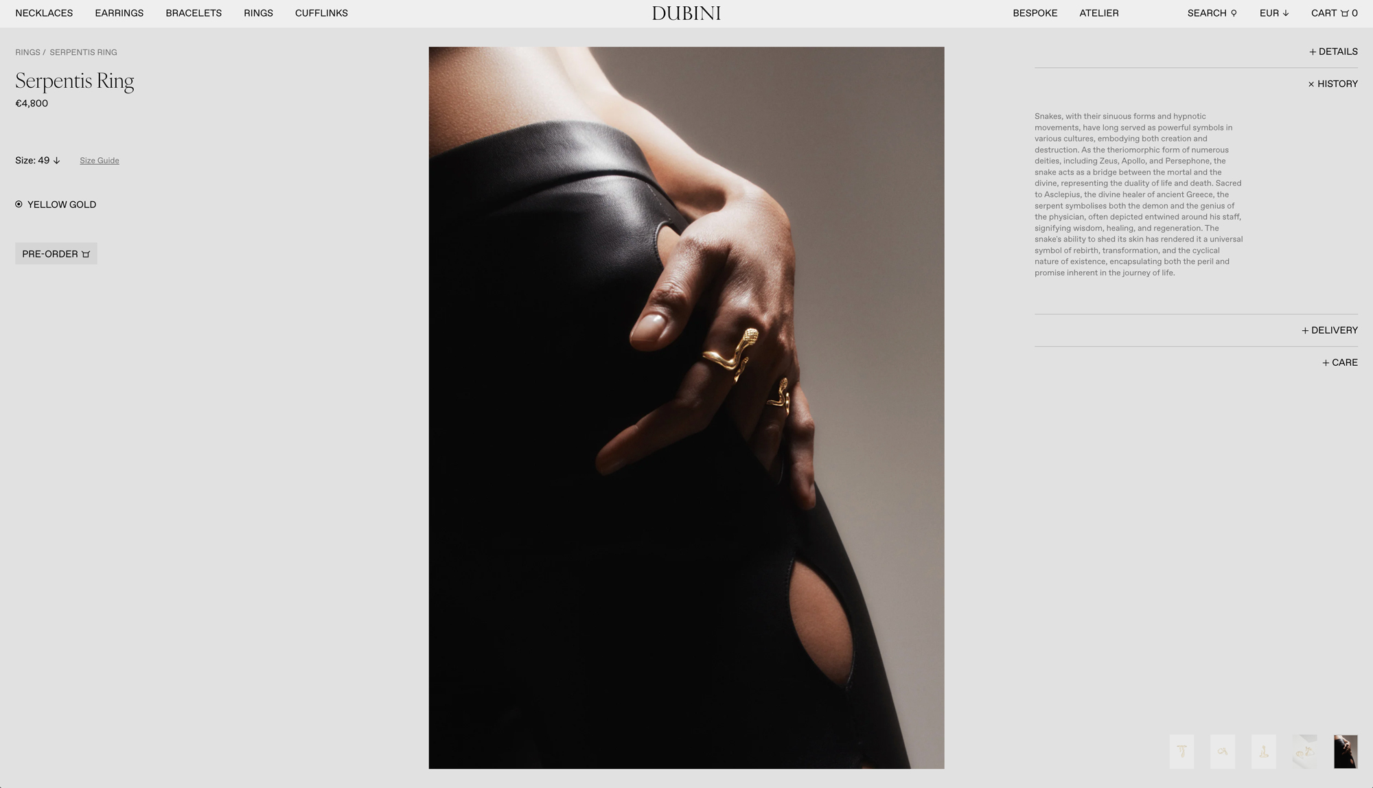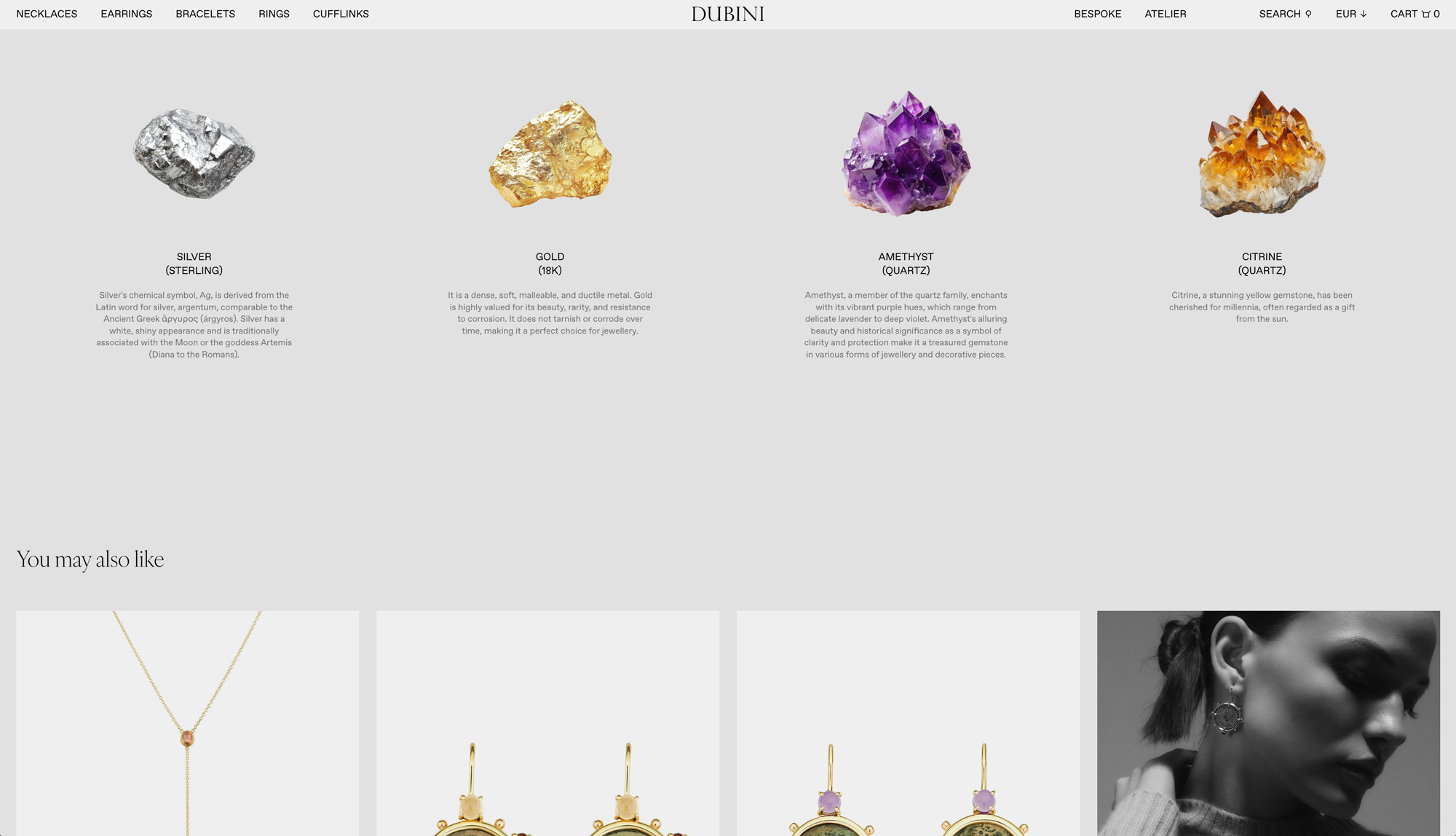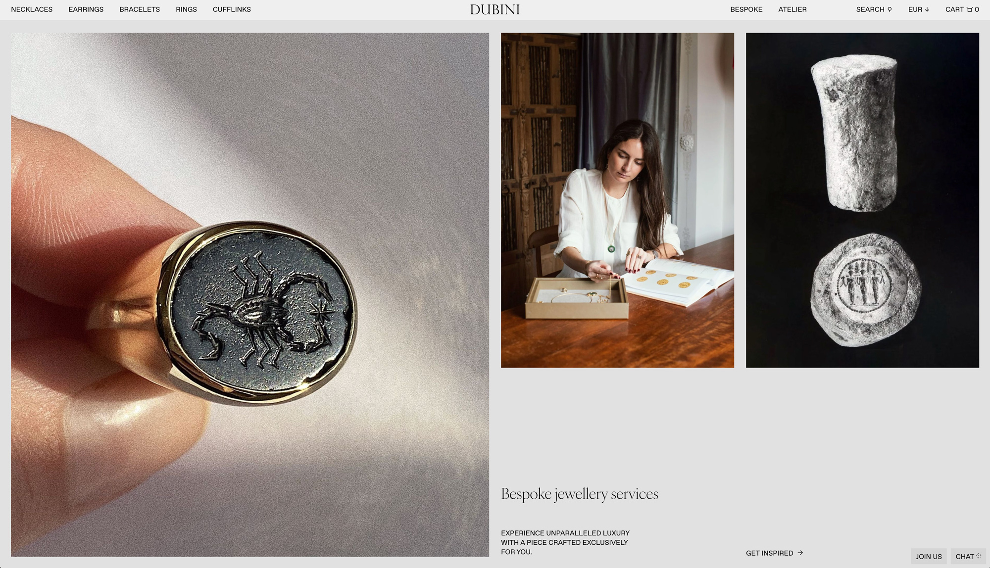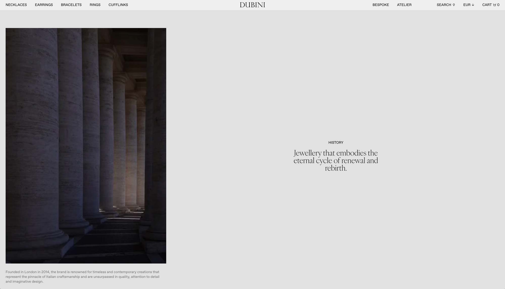 Diseño web y rebranding para Dubini, joyería dedicada a la creación de piezas únicas a través de la unión de objetos llenos de historia como monedas, gemas o grabados con intaglio junto a los materiales y piedras más nobles. Fundada en Londres en 2014, la marca es conocida por sus creaciones atemporales que representan la artesanía italiana desde la calidad, atención al detalle y el diseño.
