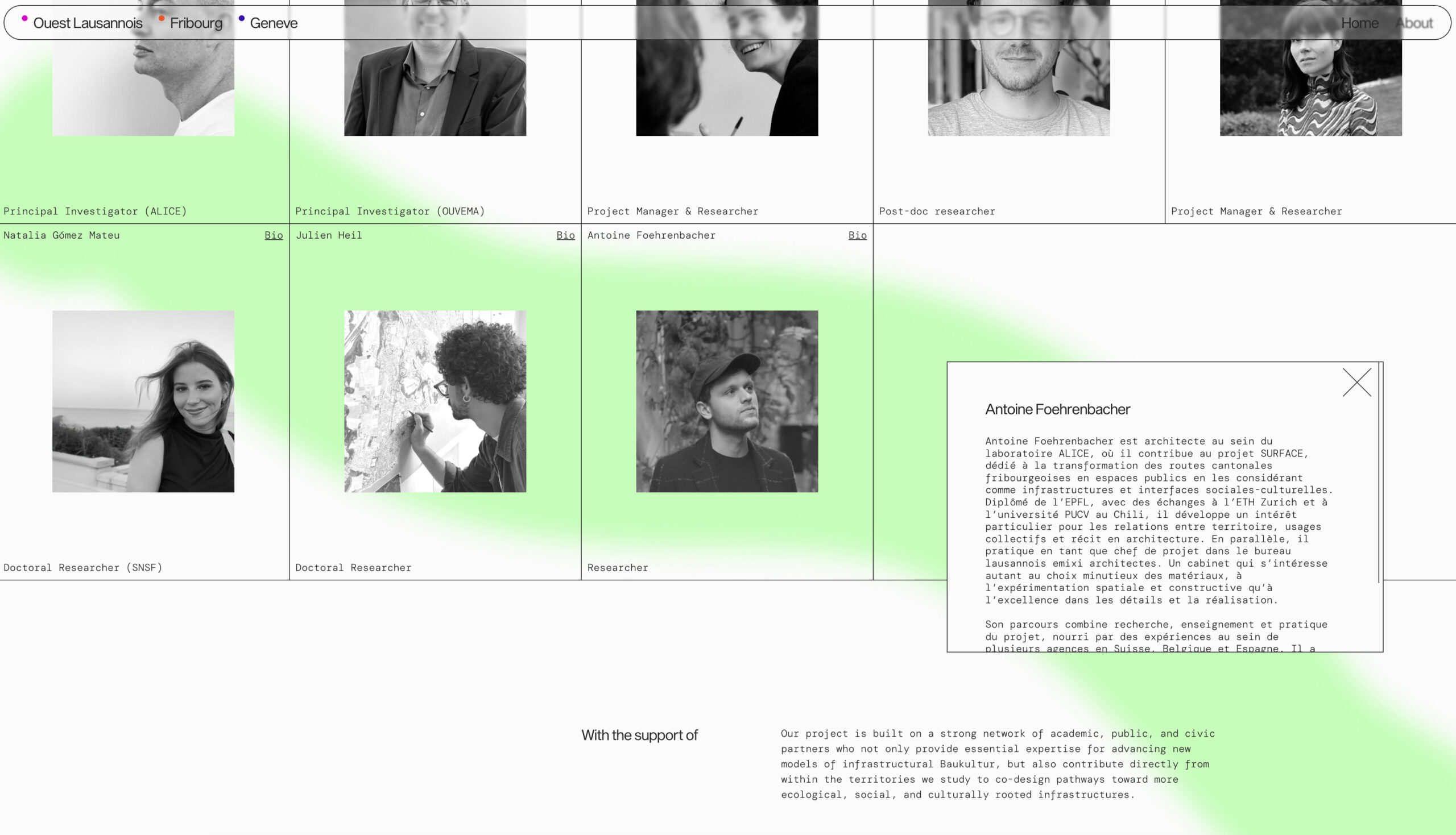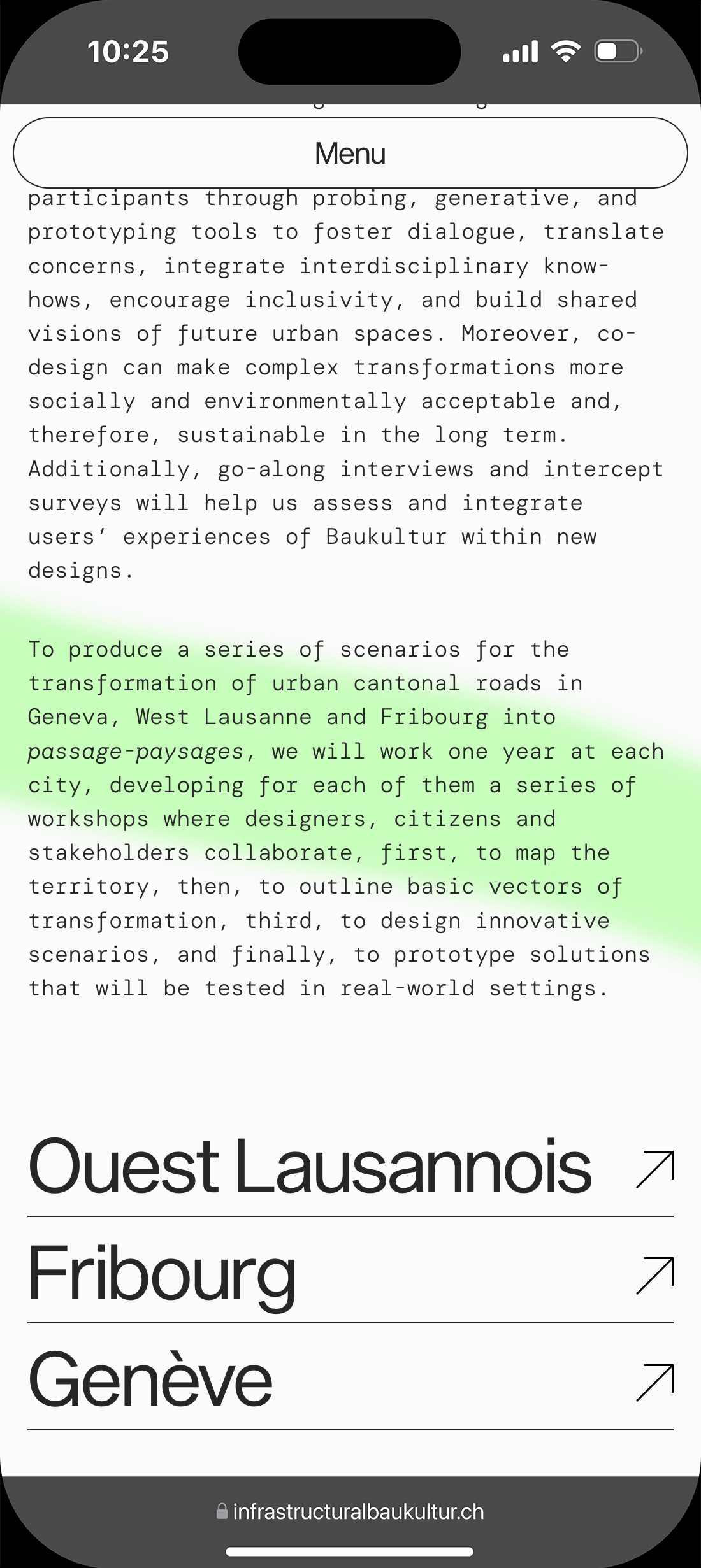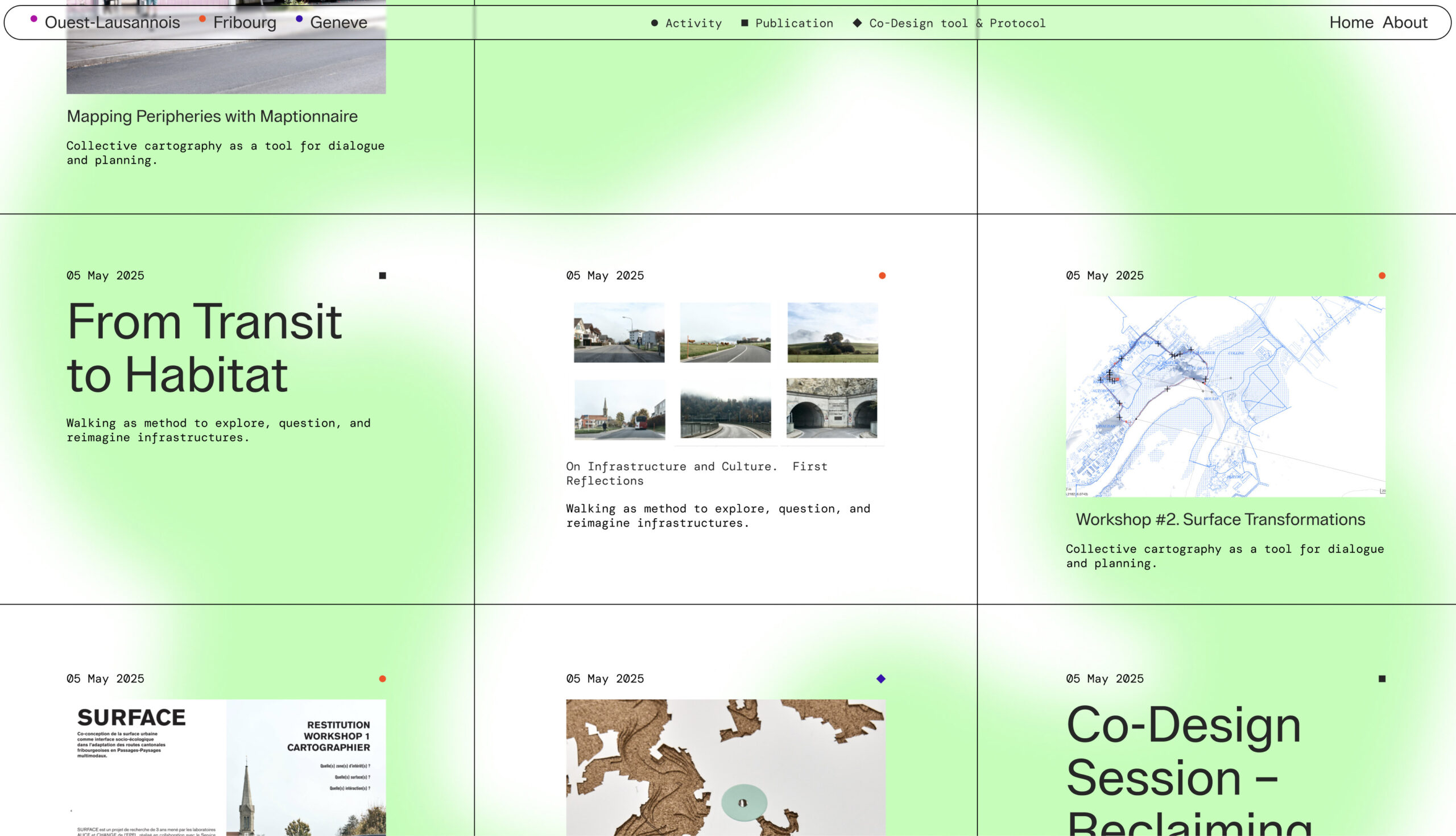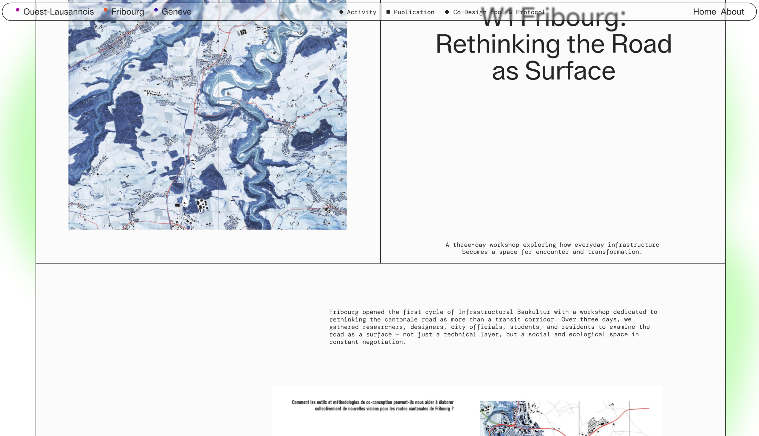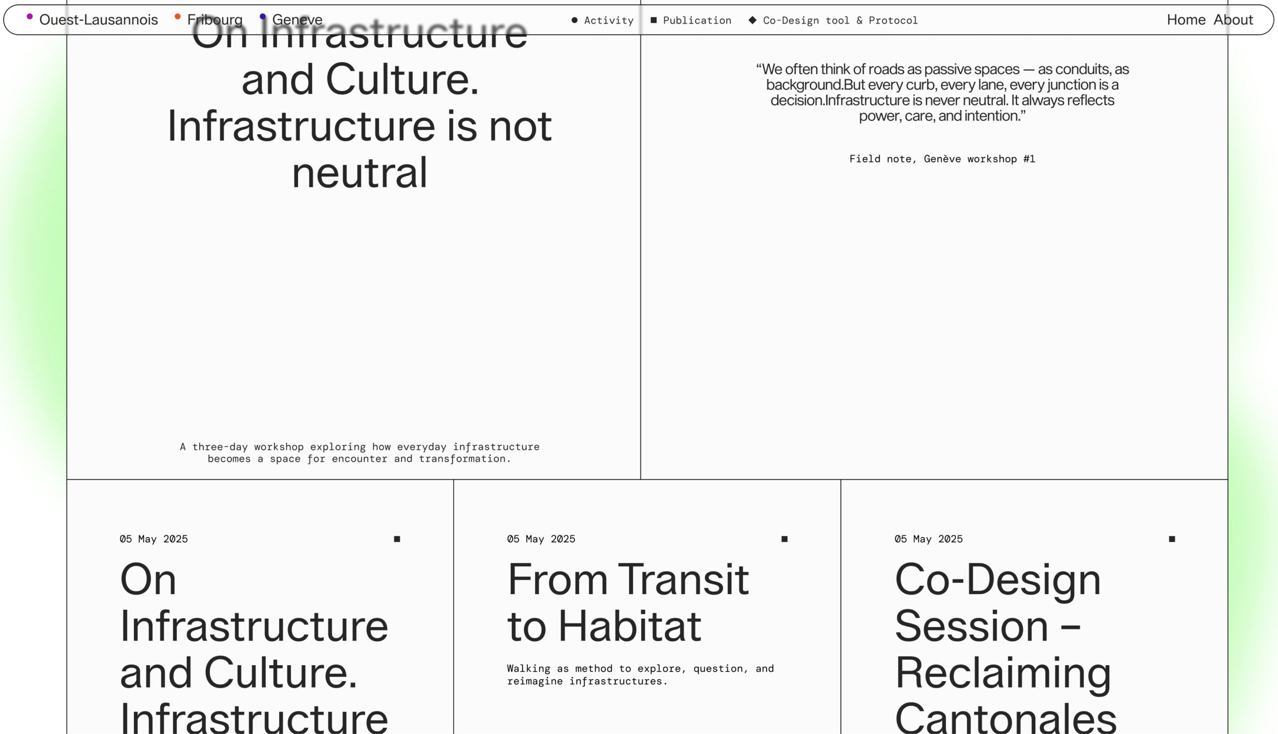 Identidad gráfica, diseño editorial y desarrollo web para Infrastructural Baukultur, un proyecto de investigación y diseño que reimagina las infraestructuras cotidianas como superficies vivas con dimensión cultural y social. Centrado en zonas periféricas e industriales de tres ciudades suizas, explora cómo estos espacios pueden transformarse en entornos más habitables a través del cuidado, el diseño y la colaboración.