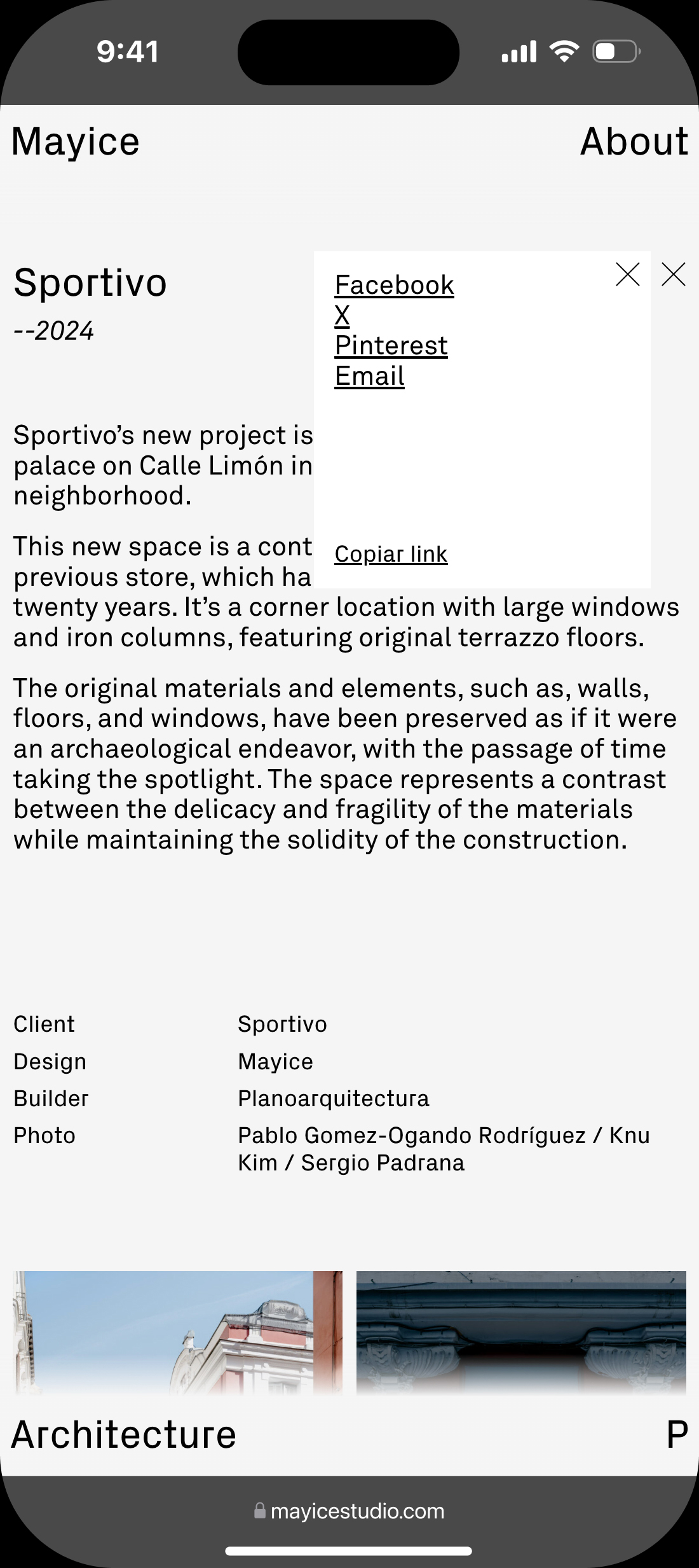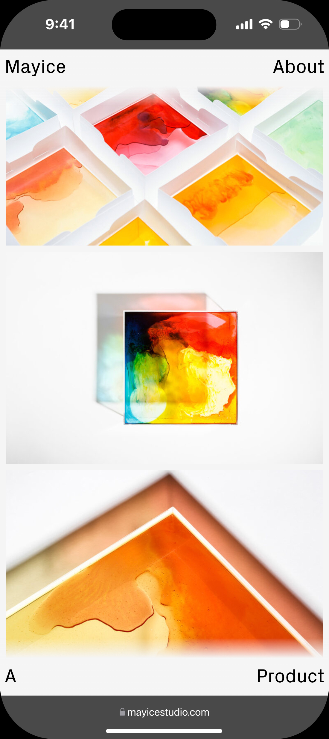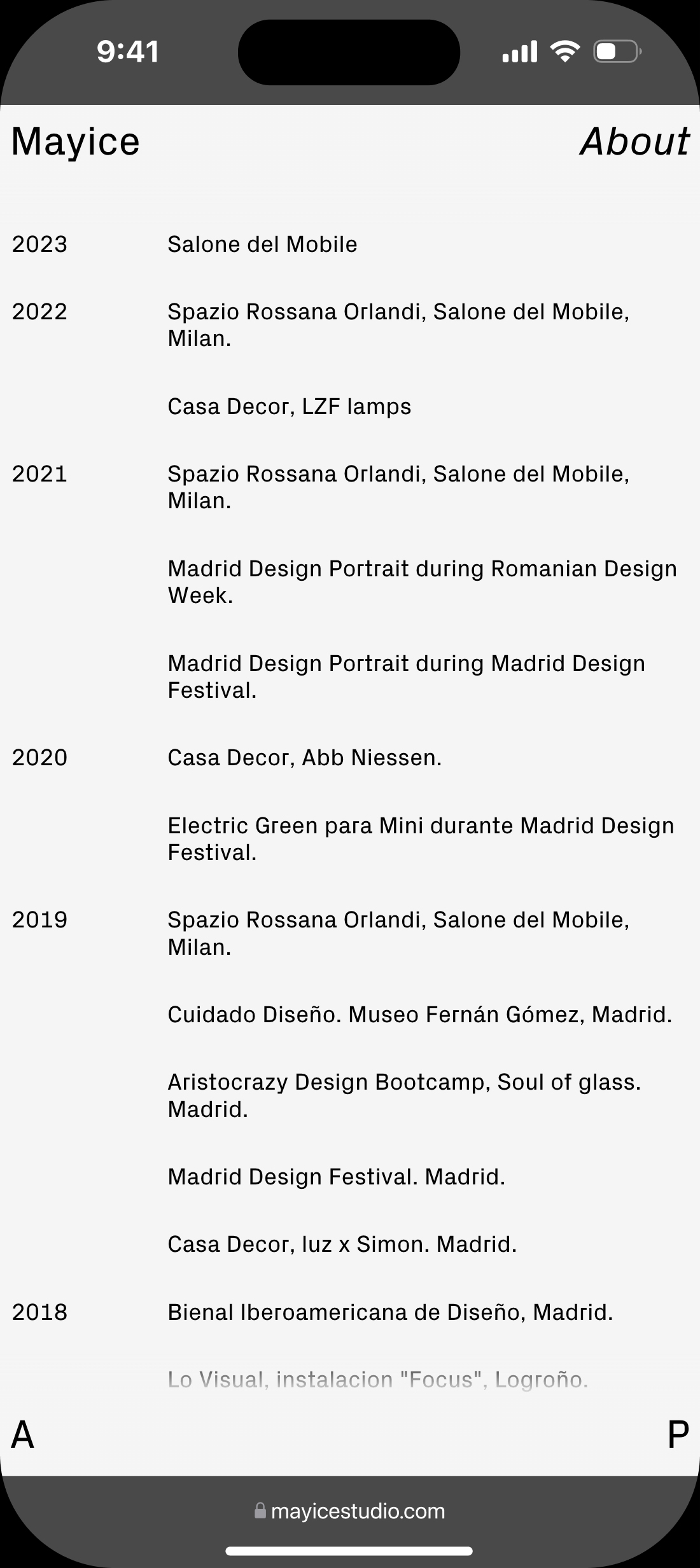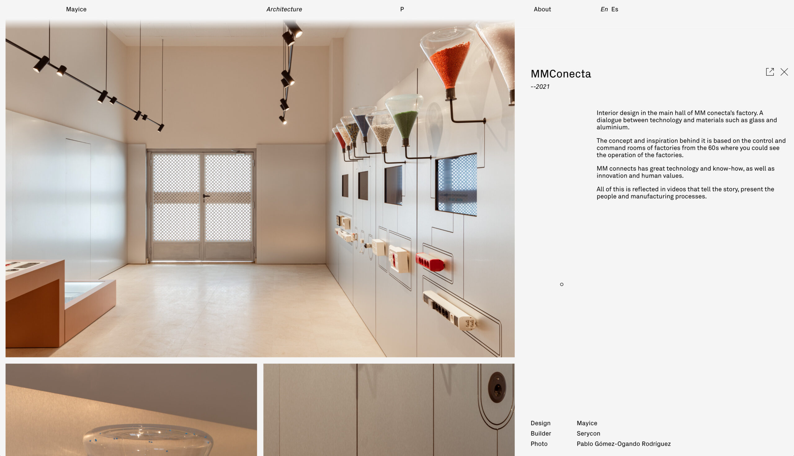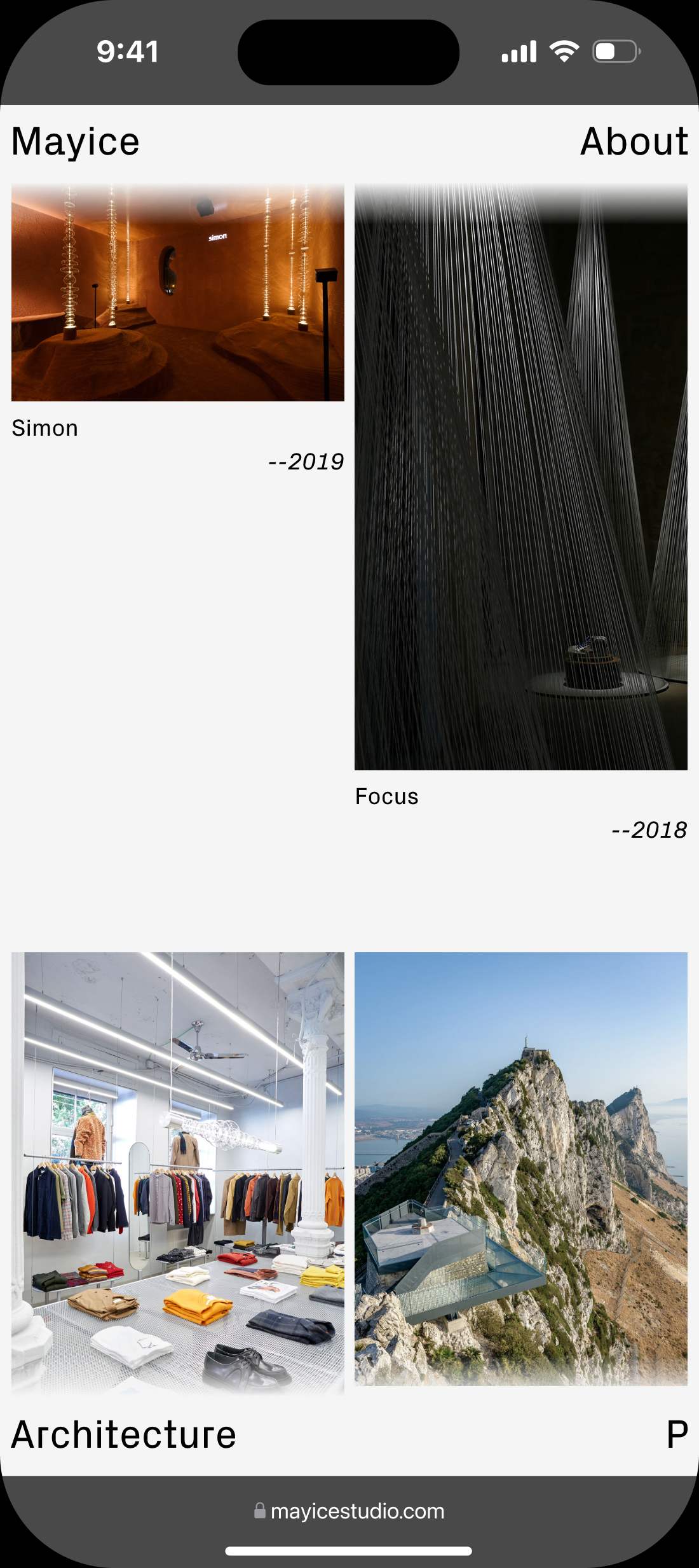 Diseño web para Mayice, estudio dedicado al diseño de producto y la arquitectura cuya esencia reside en el respeto por el alma de los materiales, su historia y funcionalidad, desde el primer boceto hasta el resultado final.